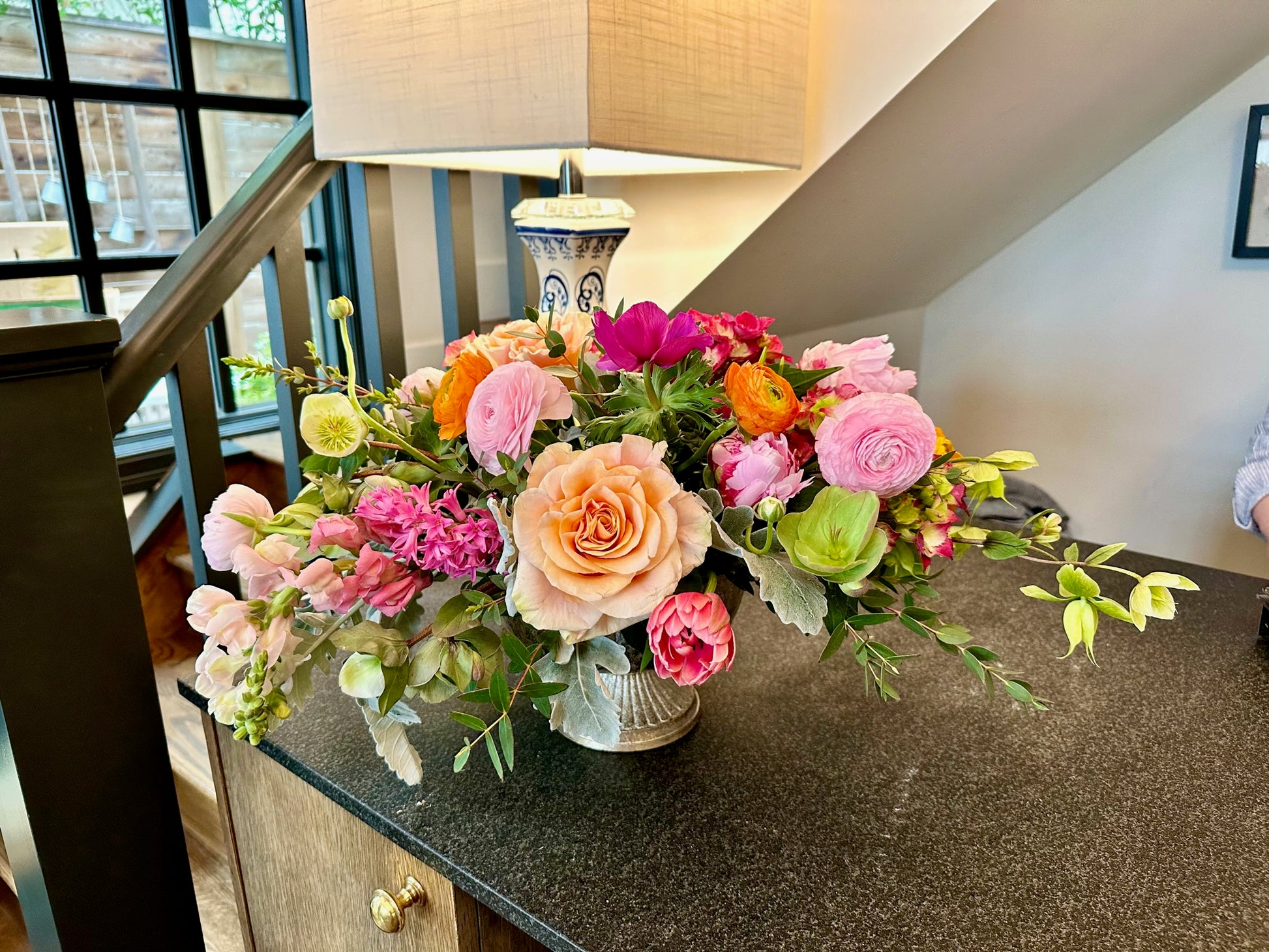 This large english style arrangement comes bursting with bright, vibrant flowers, complete with a decorative pedistal vase. This arrangement is designed to look like flowers growing in an english garden. Amazing as a centerpiece on a table or island.