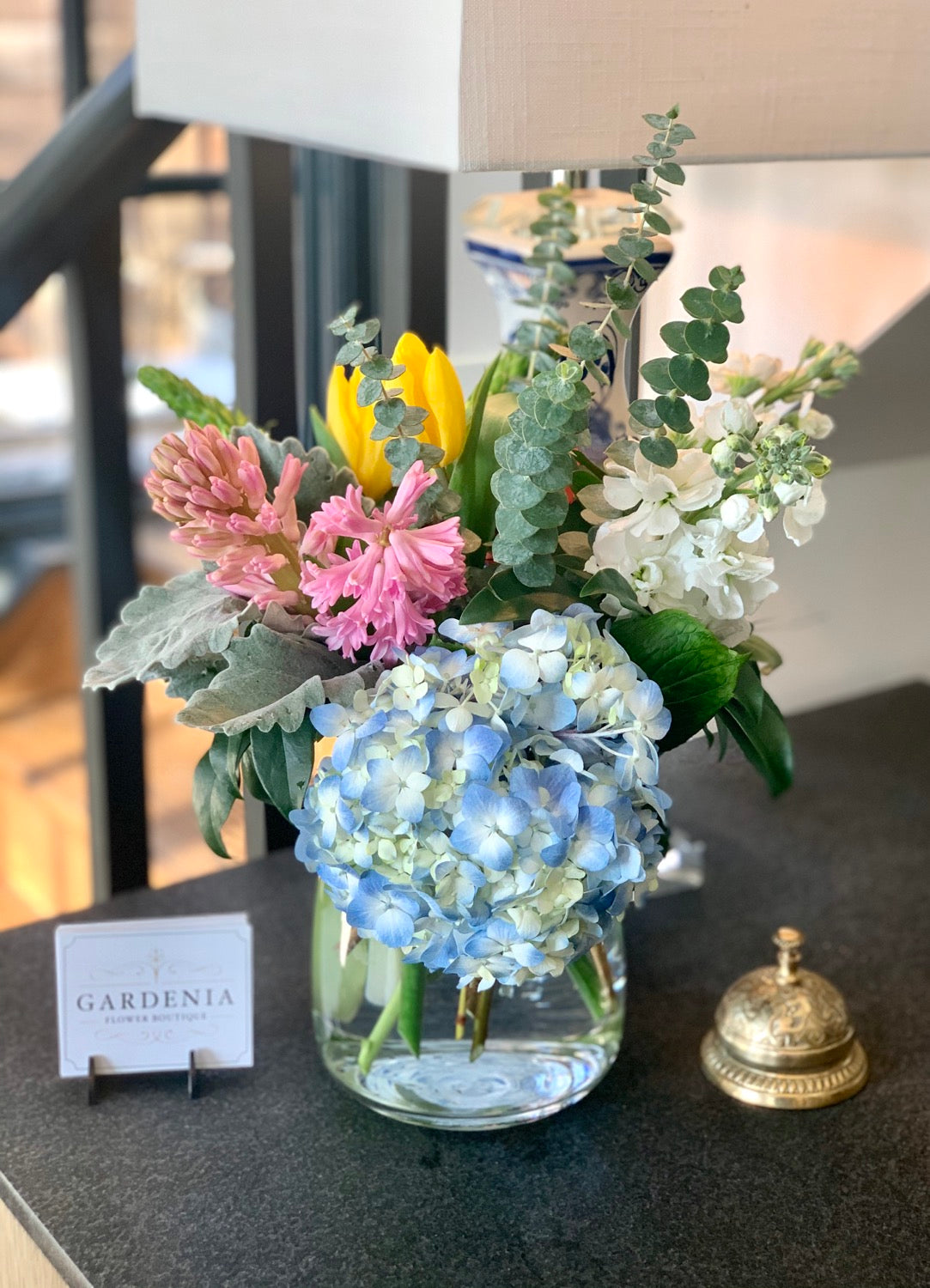Our smaller version of our big blooms arrangement, perfect on the kitchen island or as a centrepiece on your table. Pops of colourful, seasonal spring flowers accent elegant white hydrangeas and lilies in a large vase. Let us know in the comment section if there is a specific flower or colour you would like to see included.